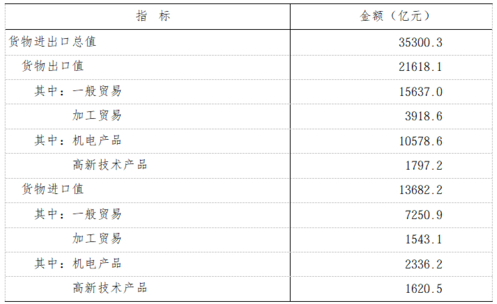 全年货物进出口总值3.53万亿元。其中,出口2.16万亿元,进口1.37万亿元。出口商品中,机电产品出口1.06万亿元,占出口总值的比重为48.9%。民营企业进出口2.69万亿元,占进出口总值的比重为76.3%。