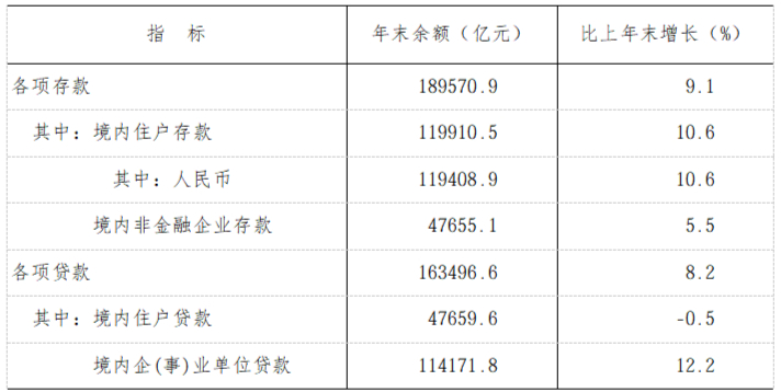 全年社会融资规模增量22391.8亿元。年末金融机构本外币存款余额189570.9亿元,比上年末增长9.1%,比年初增加15744.3亿元。金融机构本外币贷款余额163496.6亿元,增长8.2%,增加12361.9亿元。涉农贷款余额42335.6亿元,增长9.0%,增加3905.3亿元。小微企业贷款余额41501.6 亿元,增长19.7%,增加6814.5亿元。普惠小微贷款余额23575.2亿元,增长13.8%,增加2864.0亿元。绿色贷款余额27559.2亿元,增长25.4%,增加5690.4亿元。