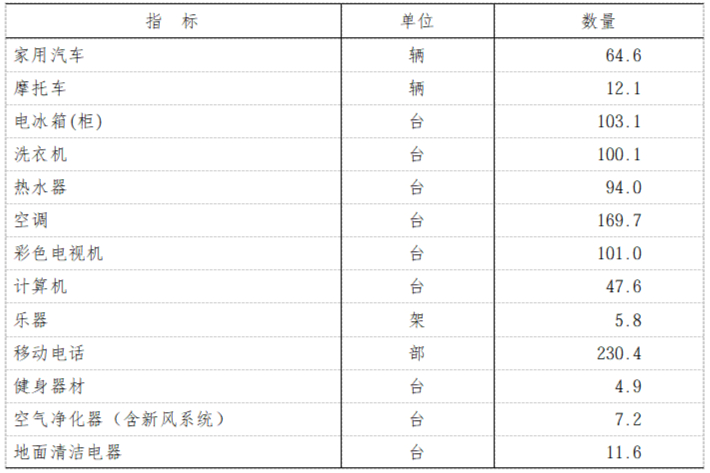 表8 2025年末每百户居民家庭主要耐用消费品拥有量