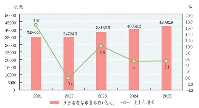图5 2021-2025年社会消费品零售总额及其增长速度