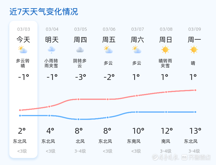 明天3月4日,德州市天气将有明显变化,预计为小雨转雨夹雪,气温在-1℃到4℃之间,东北风小于3级。与今天相比,明天天气由晴转阴雨,气温略有回升,但雨雪天气可能对出行造成影响,市民需提前做好准备。