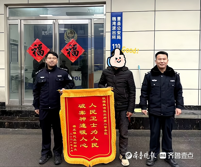 “大过年的,多亏了你们,帮我找回了电动三轮车,这面锦旗必须送!”2月26日一大早,代先生怀着激动的心情来到曹县公安局魏湾派出所,将一面印着“人民卫士为人民,破案神速暖人心”的锦旗,郑重送到办案民警手中,话语里满是感激。