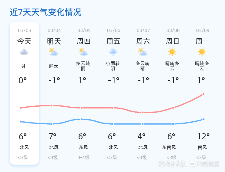 未来三天,东营市天气趋势以多云为主,偶有阴天和小雨。周三多云转阴,气温1℃至6℃,东风3-4级;周四小雨转阴,气温-1℃至6℃,北风<3级;周五多云转晴,气温-1℃至4℃,北风<3级。市民需关注天气变化,适时增减衣物,特别是周三和周四的阴雨天气,建议携带雨具,注意防滑。