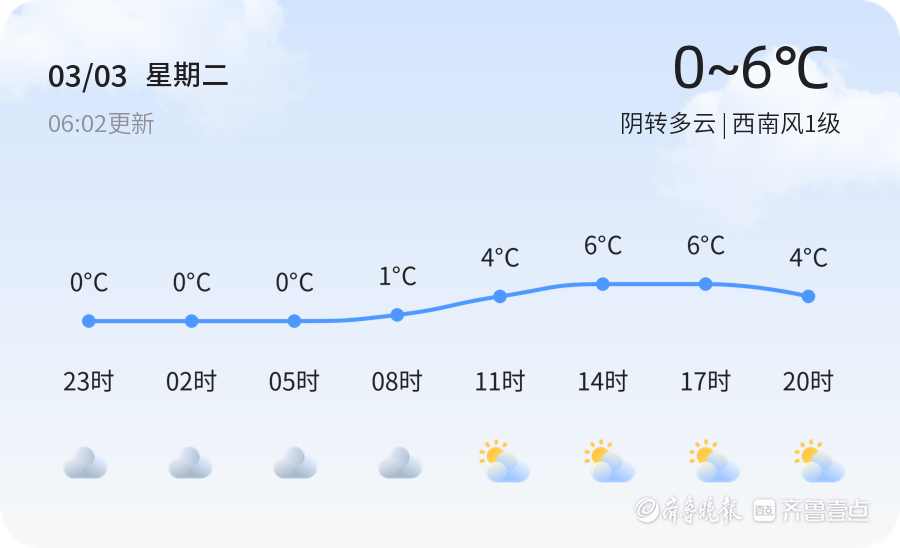 今日是3月3日,星期二,农历正月十五。东营市天气为阴转多云,白天气温预计在0℃至6℃之间,西南风1级,湿度88%,PM2.5指数119。各区天气情况基本一致,市民出行请注意保暖。