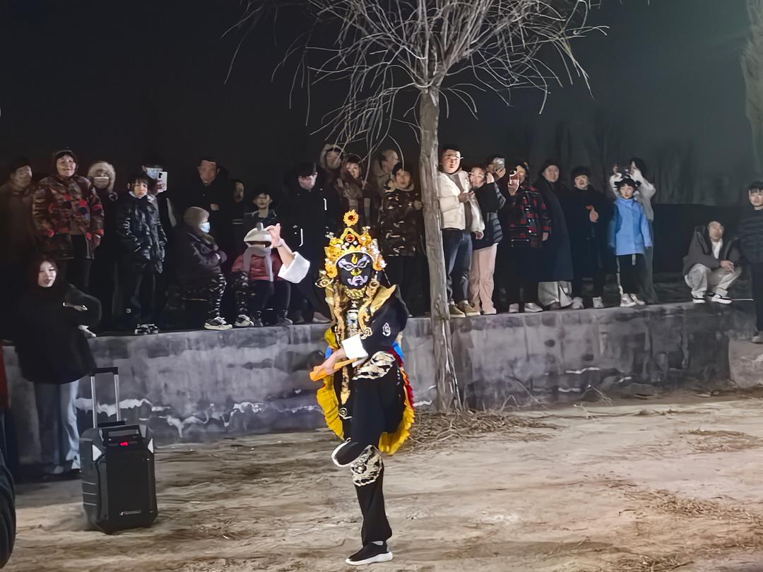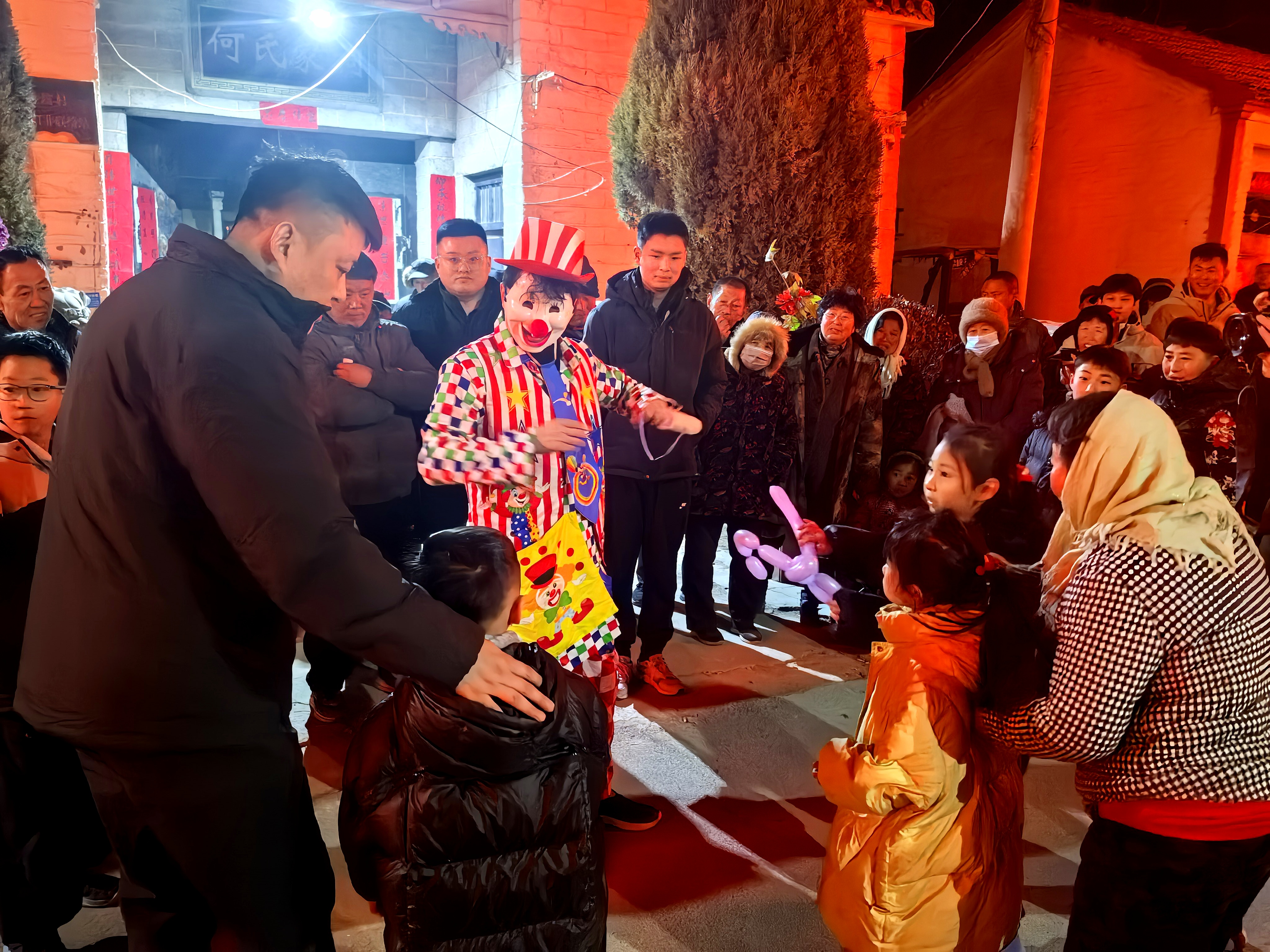 铁花腾空而起,金色火星如雨般洒落,惊起年轻女孩们的一声声尖叫:“好看!漂亮!!”小丑与孩子们热情互动,逗得孩子们咯咯直笑,有的羞涩地躲进大人背后,又忍不住探出头来。这热闹喜庆的场景,正是何垓村春节文化活动的真实写照。