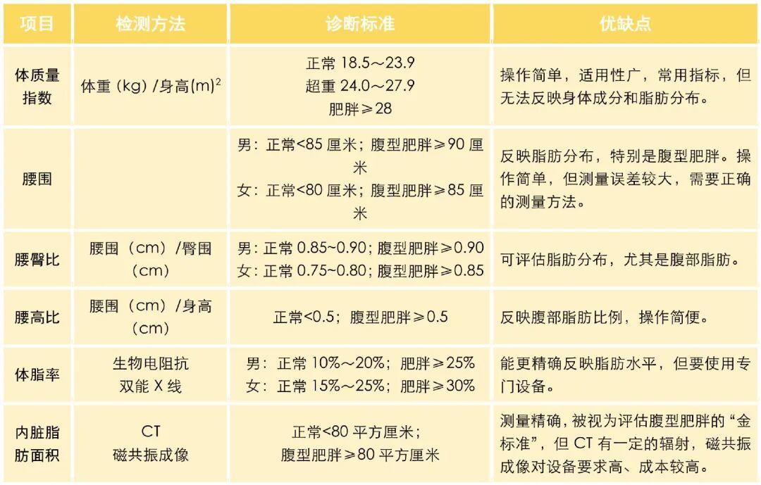 此外,腰围、腰臀比、腰高比、体脂率和内脏脂肪面积等也是常用的肥胖评估指标。下表展示了肥胖症的常用诊断标准。