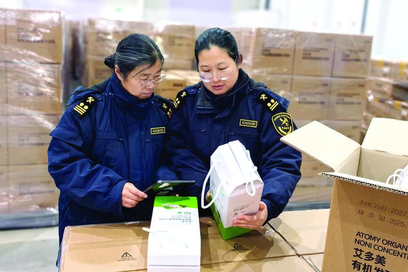 烟台融媒3月3日讯(记者 王鸿云 通讯员 刘艳青 实习生 纪苹芯 摄影报道)农历正月初十,浓浓的年味还未散去。青岛海关所属烟台海关关员徐婷婷、徐明艳一早便来到高新区艾多美(中国)有限公司。在企业仓库内,一批进口的11个集装箱47520盒艾多美有机发酵诺丽果汁饮料已整齐码放,徐婷婷两人迅速启用单兵作业设备,调阅报关资料,严格对照进口食品检验检疫相关标准,细致核查境外生产企业注册资质、官方卫生证书及产品信息,同步完成现场信息拍照留存,确保符合我国食品安全要求。
