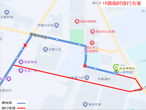 由城铁牟平站发车,沿原线路运行至港城东大街与观海路交叉口左转,沿观海路、金滩街运行至孙家滩场站。