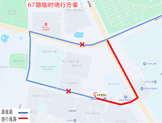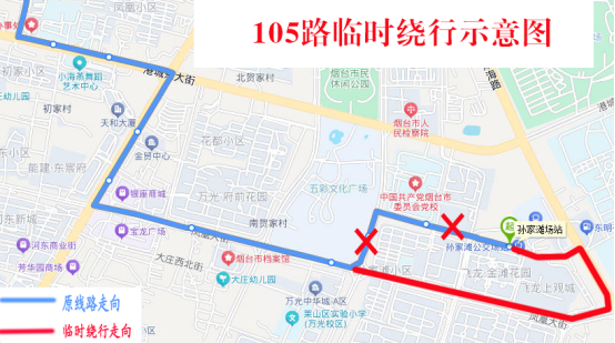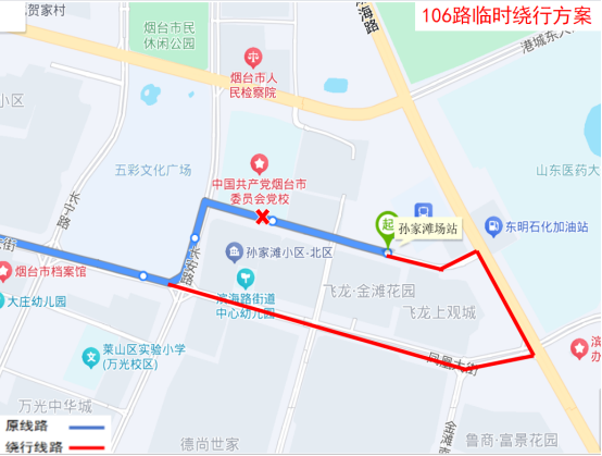 临时取消:孙家滩场站(西)、孙家滩、市委党校西门、胶东文化广场、世纪名都、东方海洋天和大厦(新华保险)、迎春大街凤凰大街北站点。