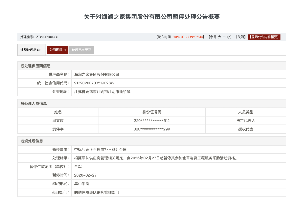当日,军队采购网还发布了关于对浙江乔治白服饰股份有限公司、宿迁市箭鹿制衣有限公司、邦威防护科技股份有限公司暂停处理公告概要,这三家公司也均因中标后无正当理由拒不签订合同,根据军队供应商管理相关规定,自2026年2月27日起暂停其参加全军物资工程服务采购活动资格。