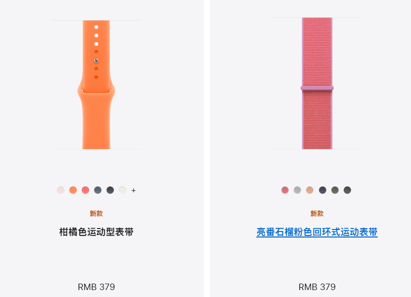 Apple Watch 的运动型表带、回环式运动表带得到更新,前者增添了浅粉色、柑橘色、亮番石榴粉色,而后者则是增加了亮番石榴粉色等,两者均售 379 元。