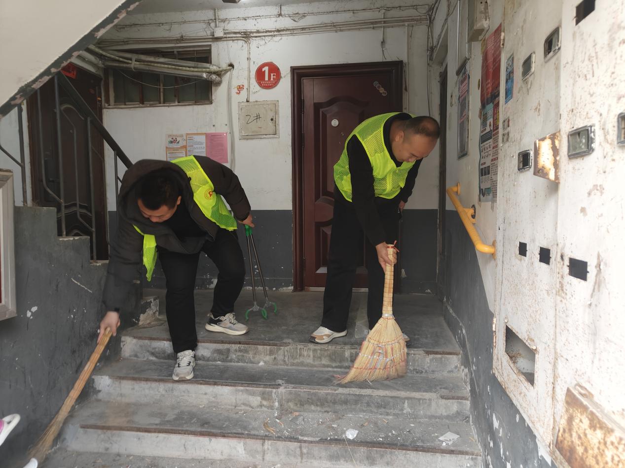 活动现场,退役军人志愿者们身着志愿服装,带着扫帚、抹布、喷壶、垃圾夹等工具,分工明确、干劲十足。大家重点对辖区楼宇进行逐层清扫,不放过任何卫生死角,无论是楼梯扶手、墙面的灰尘,还是楼道角落堆积的生活垃圾、废弃杂物,都一一清理干净、打包清运。针对楼道杂物堆积、楼宇小广告等问题,志愿者们耐心细致地进行整治。有的合力搬运楼道内废弃家具、纸箱等杂物,还有的用喷壶喷洒清洁剂,仔细铲除墙面、单元门上的小广告,不放过一处污渍、不留一丝痕迹。