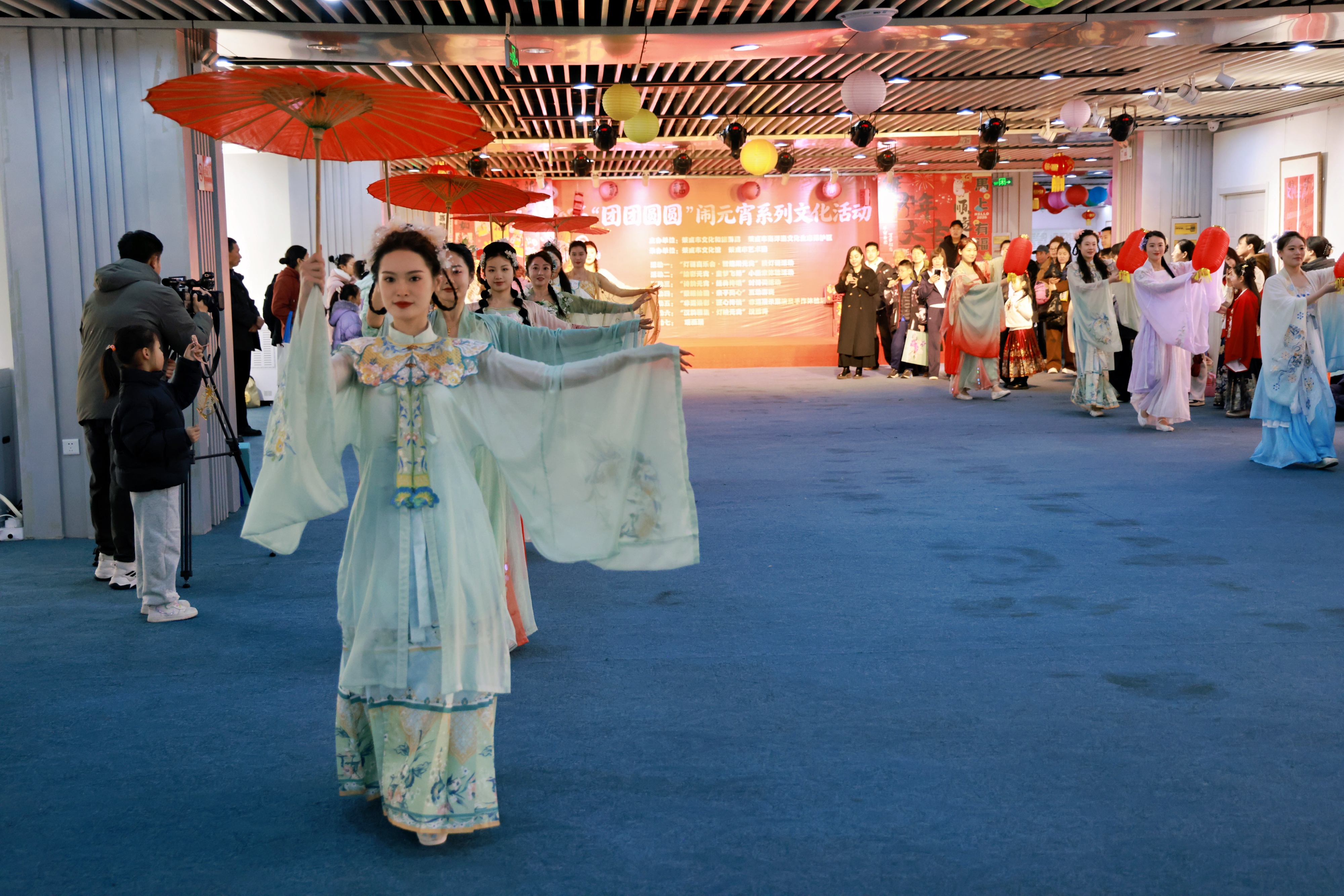 活动高潮,“汉韵雅集・灯映元宵” 汉服秀精彩上演。文艺志愿者身着各式汉服,提花灯、舞团扇登台走秀,衣袂飘飘尽显传统文化之美。