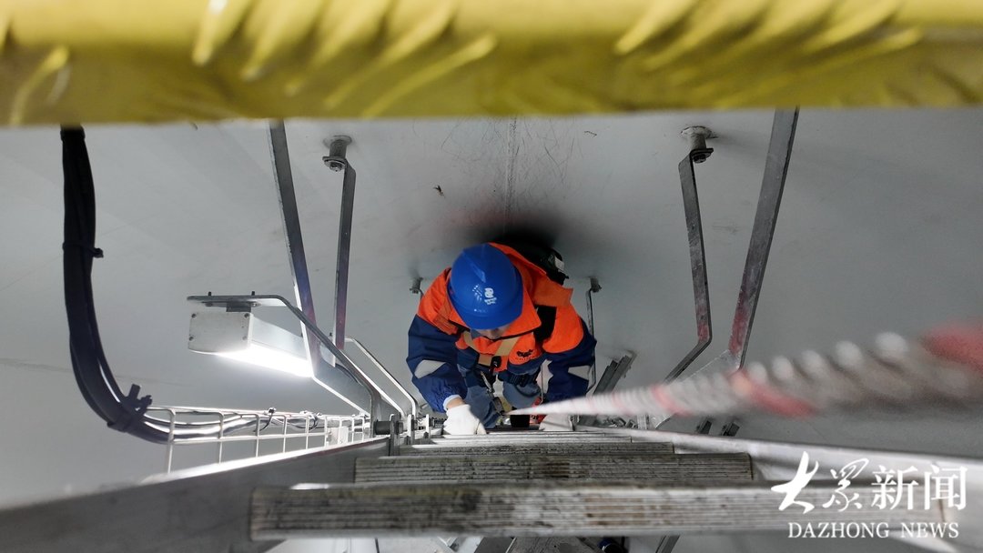 结束升压站巡检,顾不上停歇,记者跟随运检一班前往风电机组塔基,穿上重达10斤的安全带、防坠器等全套防护装备,顶着风浪攀进12米高的塔筒。筒内升降梯仅容两人站立,到达离海面约100米高处后,还需徒手攀爬十几米垂梯才能到达机舱平台。此时记者已体力告急,每一步都分外吃力,而这只是海上风电人最普通的日常。“要是接到故障报警,就不是自己爬上去这么简单了,我们还要接力把几十斤重的工具带上去。”周文海笑着说。