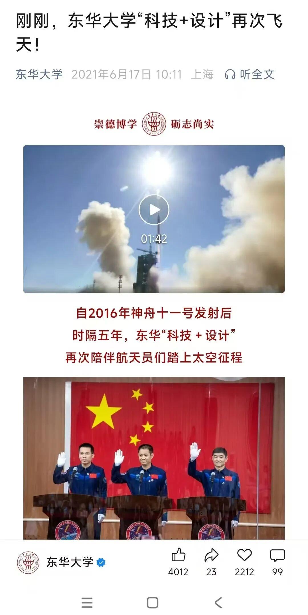比如,在神舟载人飞船成功发射的消息传出后,东华大学即刻推出新媒体作品《刚刚,东华大学“科技+设计”再次飞天!》,将飞船升空与学校70年“飞天梦”巧妙融合,微信公众号文章阅读量迅速突破10万,“校庆+航天”的精妙策划打响了“东华品牌”。