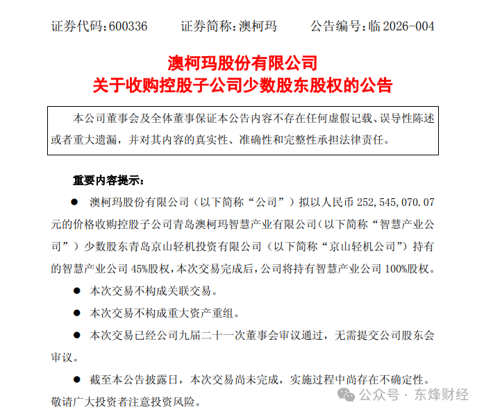 2月27日,澳柯玛(600336.SH)发布公告,宣布拟以2.52亿元价格,从ST京机(000821.SZ)关联方青岛京山轻机投资有限公司(简称“青岛京山”)手中,溢价收购青岛澳柯玛智慧产业有限公司(简称“澳柯玛智慧产业”)45%股权。