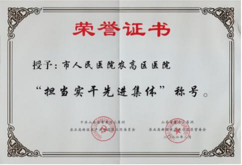 2月27日,中共山东省委黄河三角洲农业高新技术产业示范区工作委员会、山东省黄河三角洲农业高新技术产业示范区管理委员会授予东营市人民医院农高区医院“担当实干先进集体”称号。这一奖项是对医院工作的肯定,也是对全体医务工作者扎根基层、服务群众的认可。