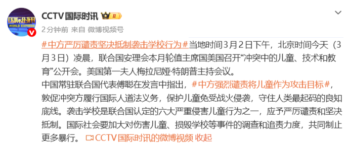 中国常驻联合国代表傅聪在发言中指出,中方强烈谴责将儿童作为攻击目标,敦促冲突方履行国际人道法义务,保护儿童免受战火侵袭,守住人类最起码的良知底线。袭击学校是联合国认定的六大严重侵害儿童行为之一,应予严厉谴责和坚决抵制。国际社会要加大对伤害儿童、损毁学校等事件的调查和追责力度,共同制止更多暴行。