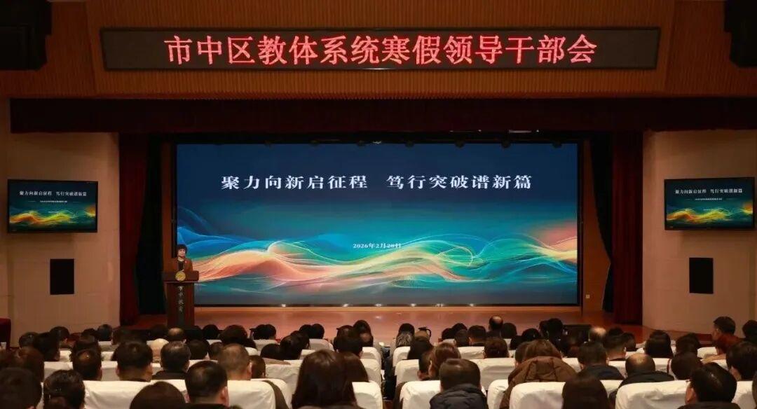千帆竞发江河阔,万马奔腾天地春。2月28日上午,济南市市中区教体系统2026年寒假领导干部会在市中区教体局四楼礼堂召开。会议以“聚力向新启征程 笃行突破谱新篇”为主题,贯彻落实党的二十届四中全会精神和2026年全国、省、市教育工作会议精神,总结工作经验,分析问题不足,部署工作任务,以惟实励新、勇毅笃行的奋斗姿态,在“十五五”开局之年为全区“二次创业”由“破题起势”转向“突破跃升”提供坚强教体支撑。