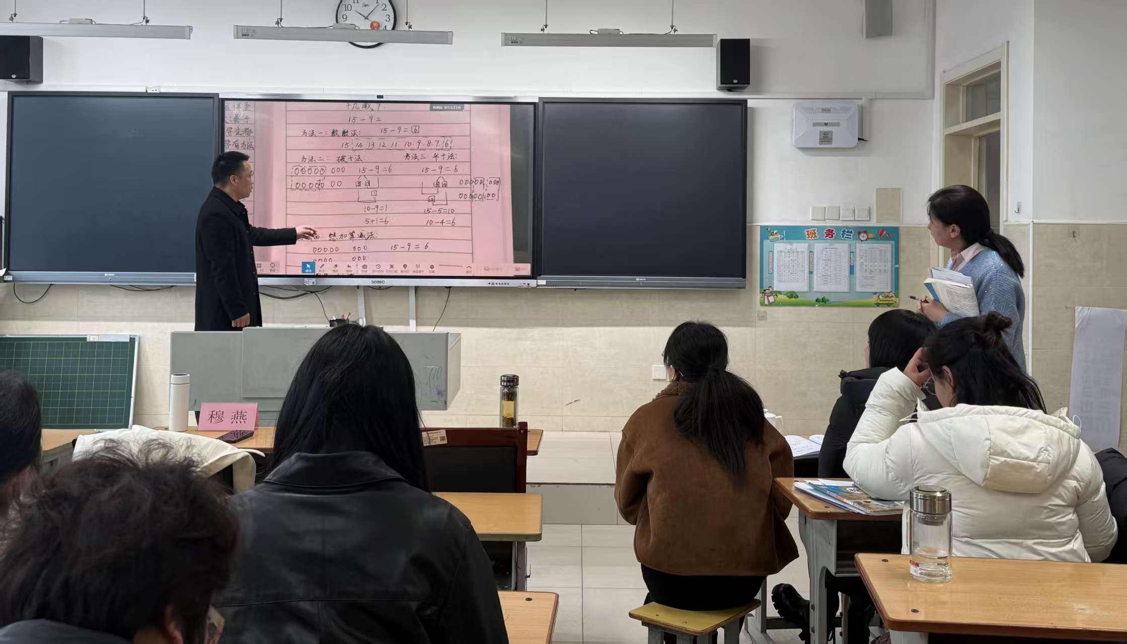 同时,穆燕开展数学集体备课专题培训,全体数学教师参会。各数学备课组提前紧扣新课标、立足学段学情,完成单元解读、例题空讲、检测题编制等筹备工作。活动现场,各学段备课团队依次展示成果:一年级聚焦基础运算与生活场景结合,贴合低龄学生认知;三年级紧扣学段知识衔接,强化分层教学设计;六年级立足数学核心素养,开展单元整体深度备课,为全体教师提供可借鉴、可落地的实践范例。展示后,教师们交流感悟、分享经验,穆燕充分肯定各备课组成果,并对后续集体备课提出专业指导意见,明确教研方向。