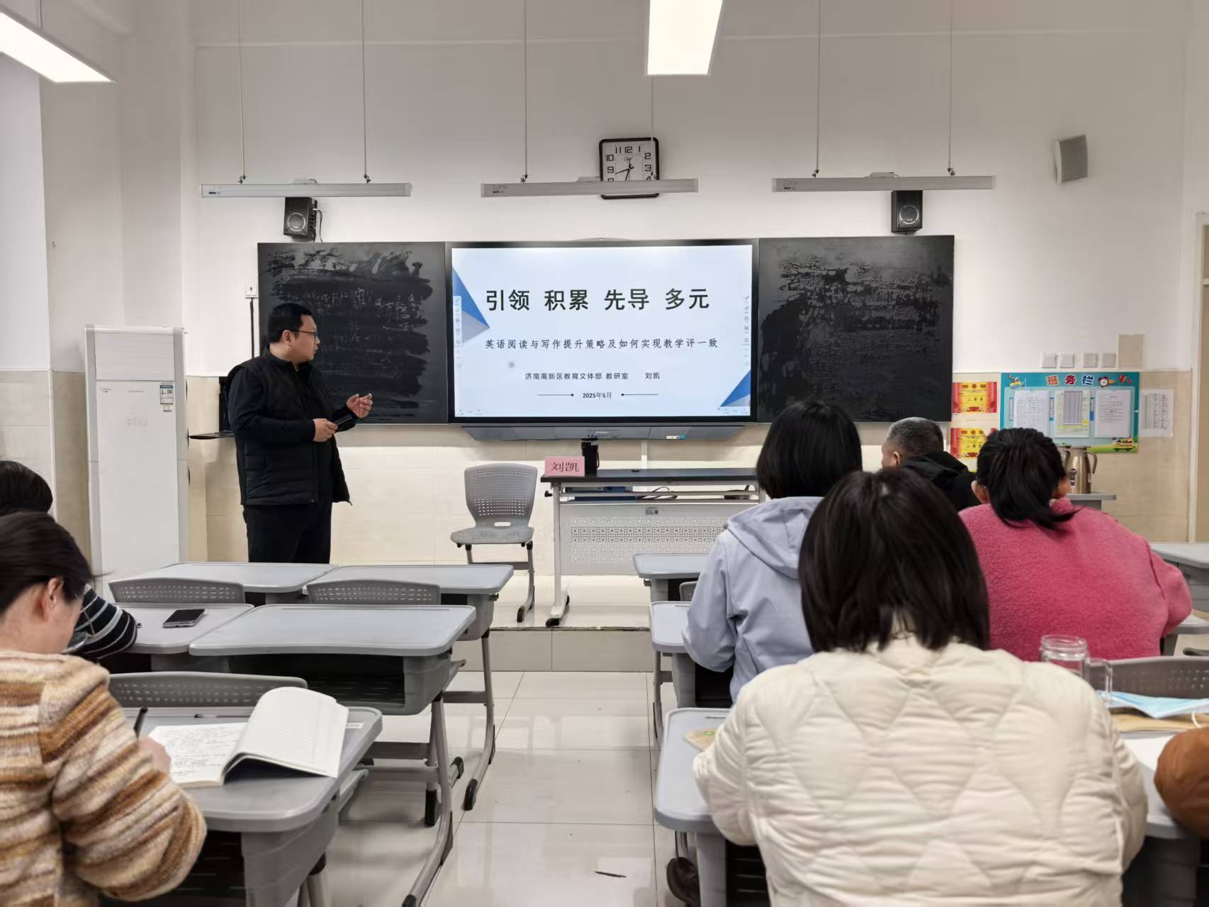 刘凯为全体英语教师带来“英语阅读与写作提升策略及如何实现教学评一致”专题培训。培训围绕四大核心板块展开:结合典型课例剖析传统阅读教学痛点,指导设计情境化问题链引导学生深度思辨;落实“以读促写”理念,通过任务拆解、语言支架搭建,助力学生从“能写”到“善写”;解读新课标下“教学评一致性”核心内涵,强调教学目标、学习活动与评价方式统一;讲解评价量表设计方法,指导教师构建科学可操作的评价工具。此次培训有效更新教师教学理念,破解教学困惑。