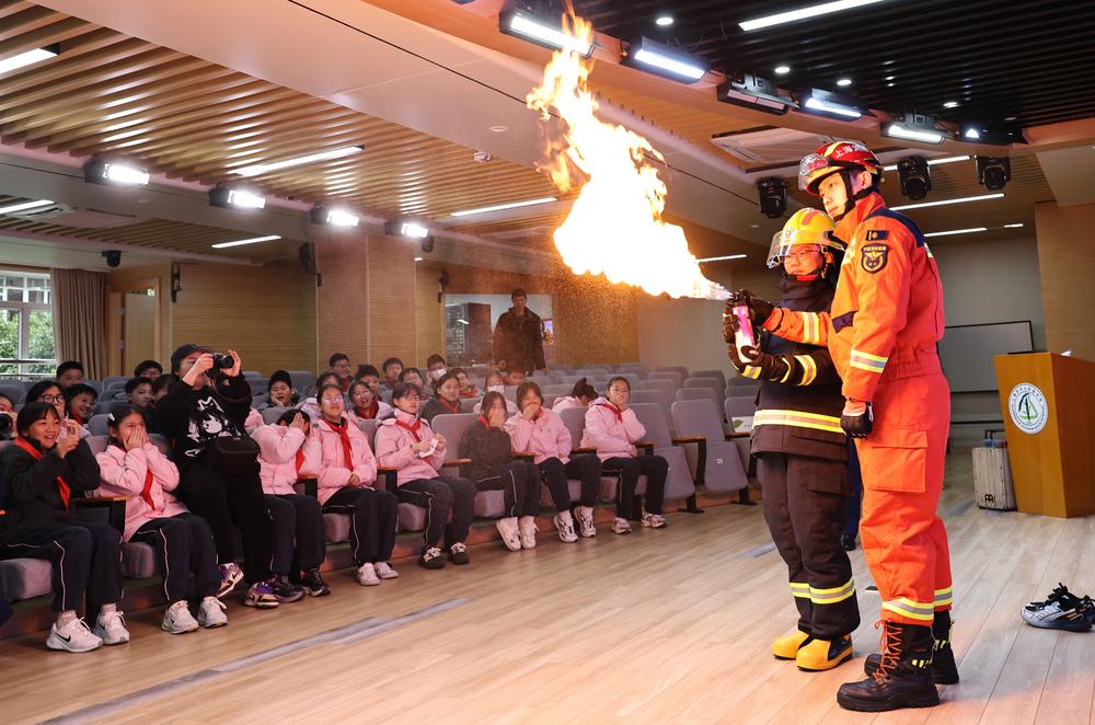 2일 상하이시 창닝(長寧)구 소방구조국과 함께 소방안전 실습 수업 중인 상하이시 톈산(天山)중학교 학생.