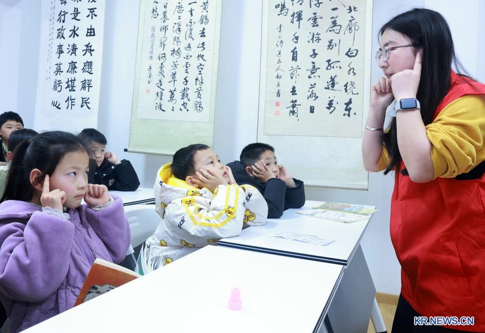 자원봉사자가 2일 우한(武漢)시 우창(武昌)구 황허러우(黃鶴樓)가도(街道·한국의 동) 독서 커뮤니티에서 어린이들에게 귀 건강 체조를 가르치고 있다.