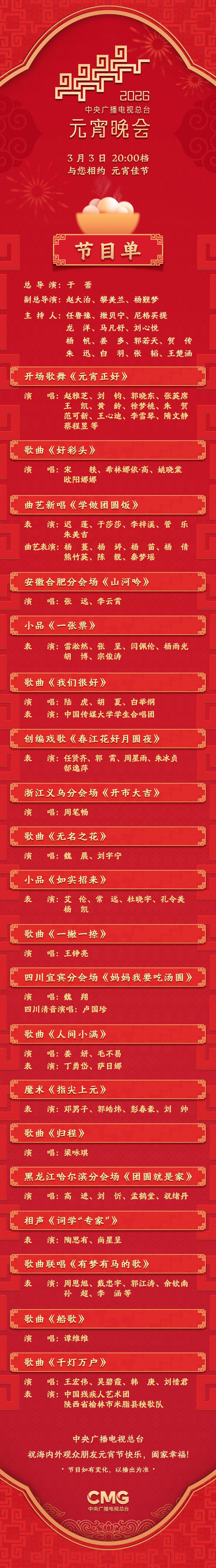 节目单来了!中央广播电视总台《2026年元宵晚会》今晚播出