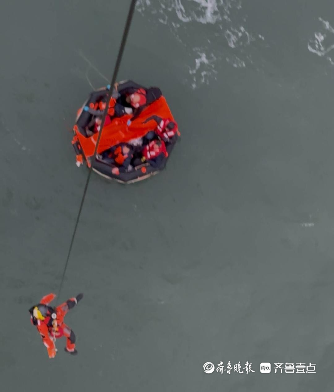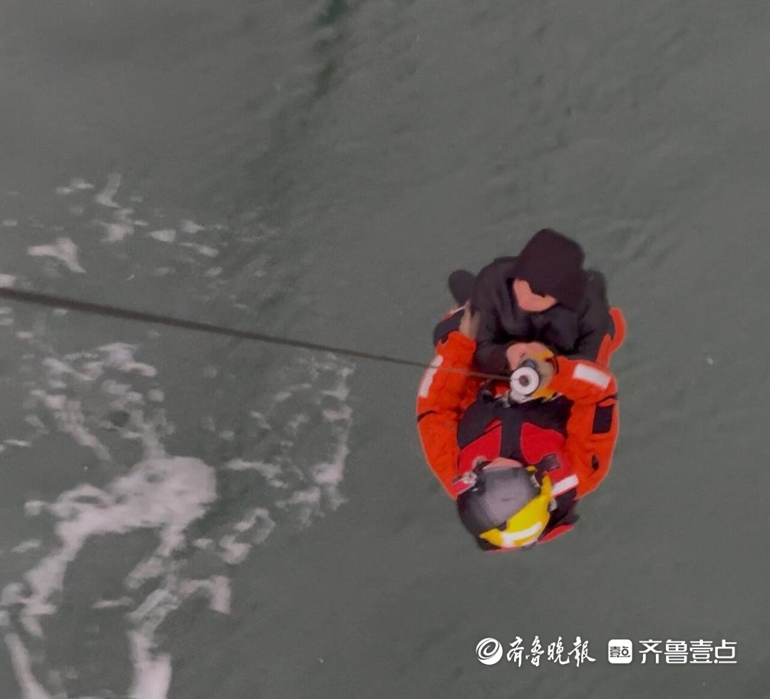 现场风力6-7级,浪高2-3米,伴有小雨。救生筏空间狭小,在风浪中剧烈摇摆,给登筏救助带来了巨大挑战。机长牢牢把定驾驶杆,控制机身稳稳悬停;绞车手紧握吊索,降低救生员随风摆动的幅度;救生员数次被狂风掀偏,坠入冰冷海水,全身湿透,仍竭力控制身体姿态,向救生筏靠近!10米,5米,2米……终于,救生员瞅准机会,一击制胜,准确将高绳抛入救生筏,顺利登筏。