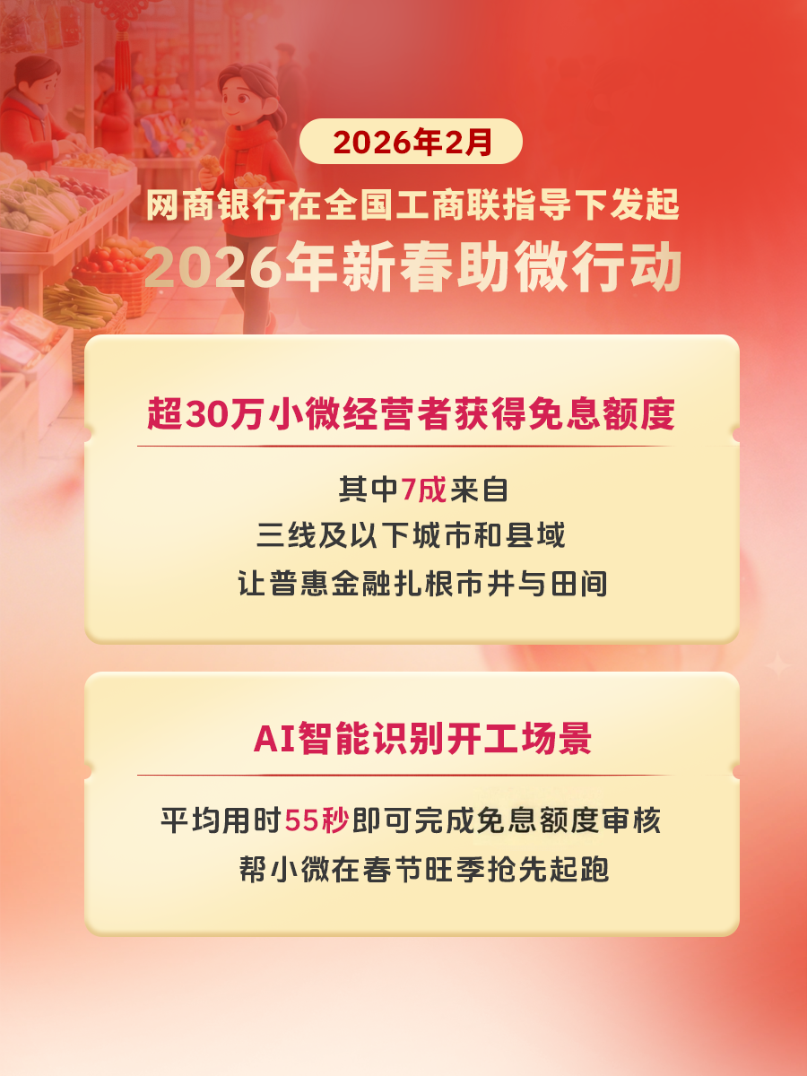 2026年3月3日,在全国工商联指导下,网商银行发起的“2026年新春助微行动”收官。数据显示,该行动自2月17日启动以来,网商银行已累计为超30万户小微经营者提供了免息额度支持,帮助他们抓住新春消费旺季,跑出开工“加速度”。