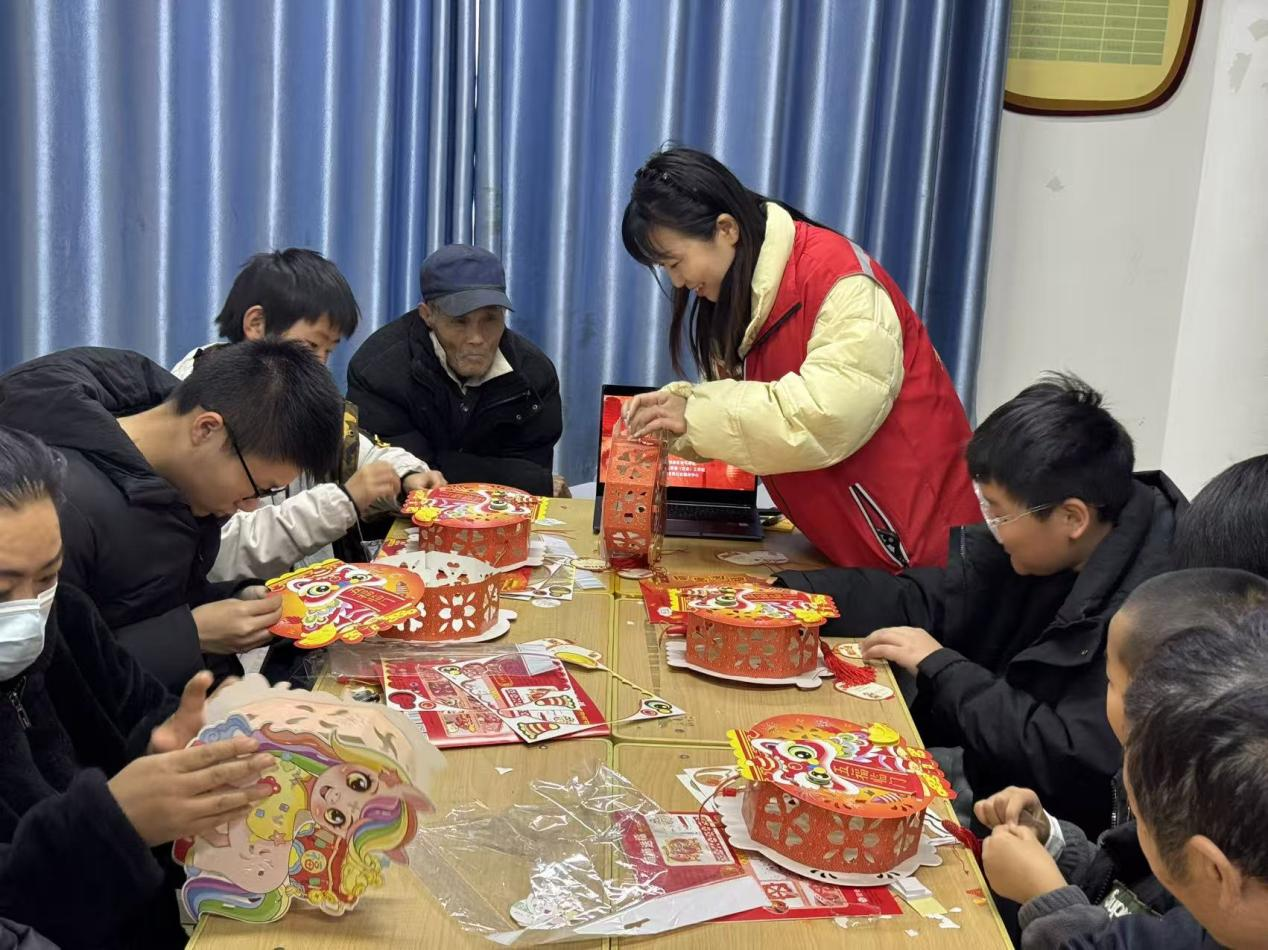 在古韵传承环节,趣味灯谜巧妙融合了传统礼仪与现代知识,孩子们在猜谜中学习民俗、安全与成语知识,寓教于乐。最具温情的“巧手制花灯”环节,社工与志愿者分发手工材料包,指导亲子家庭共同制作。一盏盏承载心愿的花灯组成“童心花灯墙”,成为现场一道亮丽的风景线。