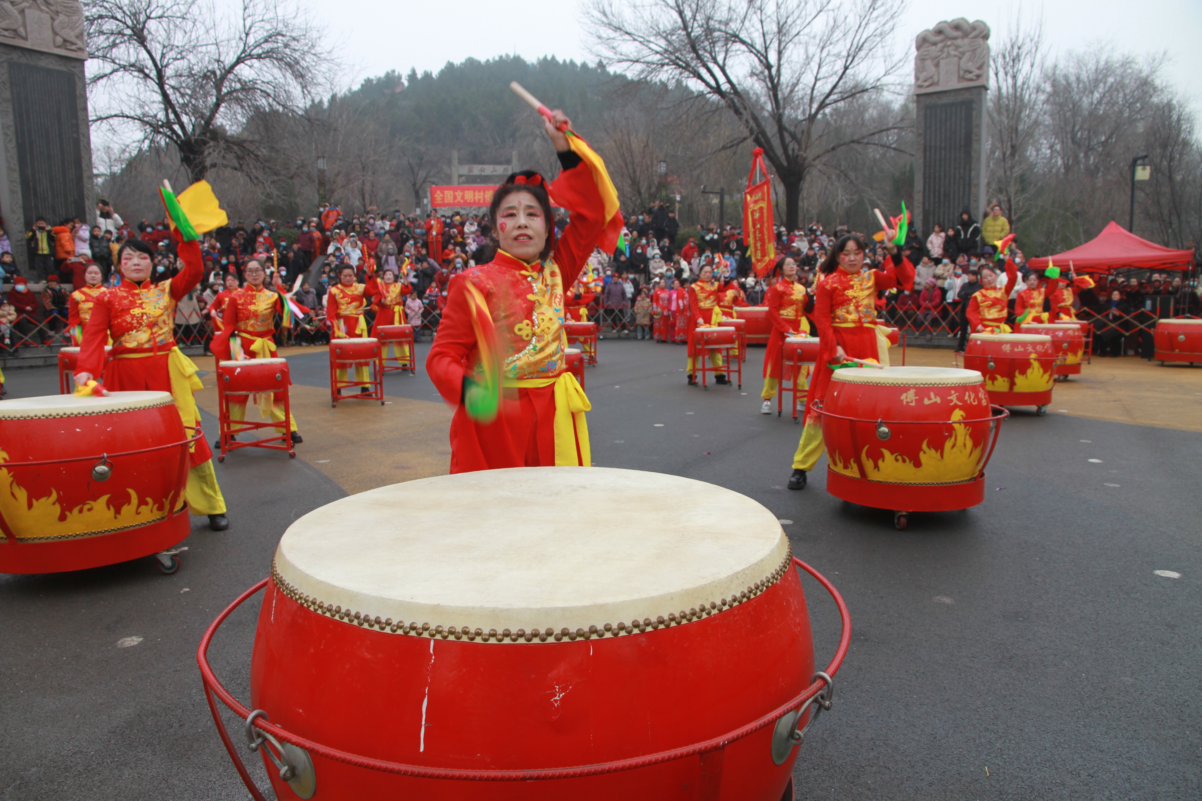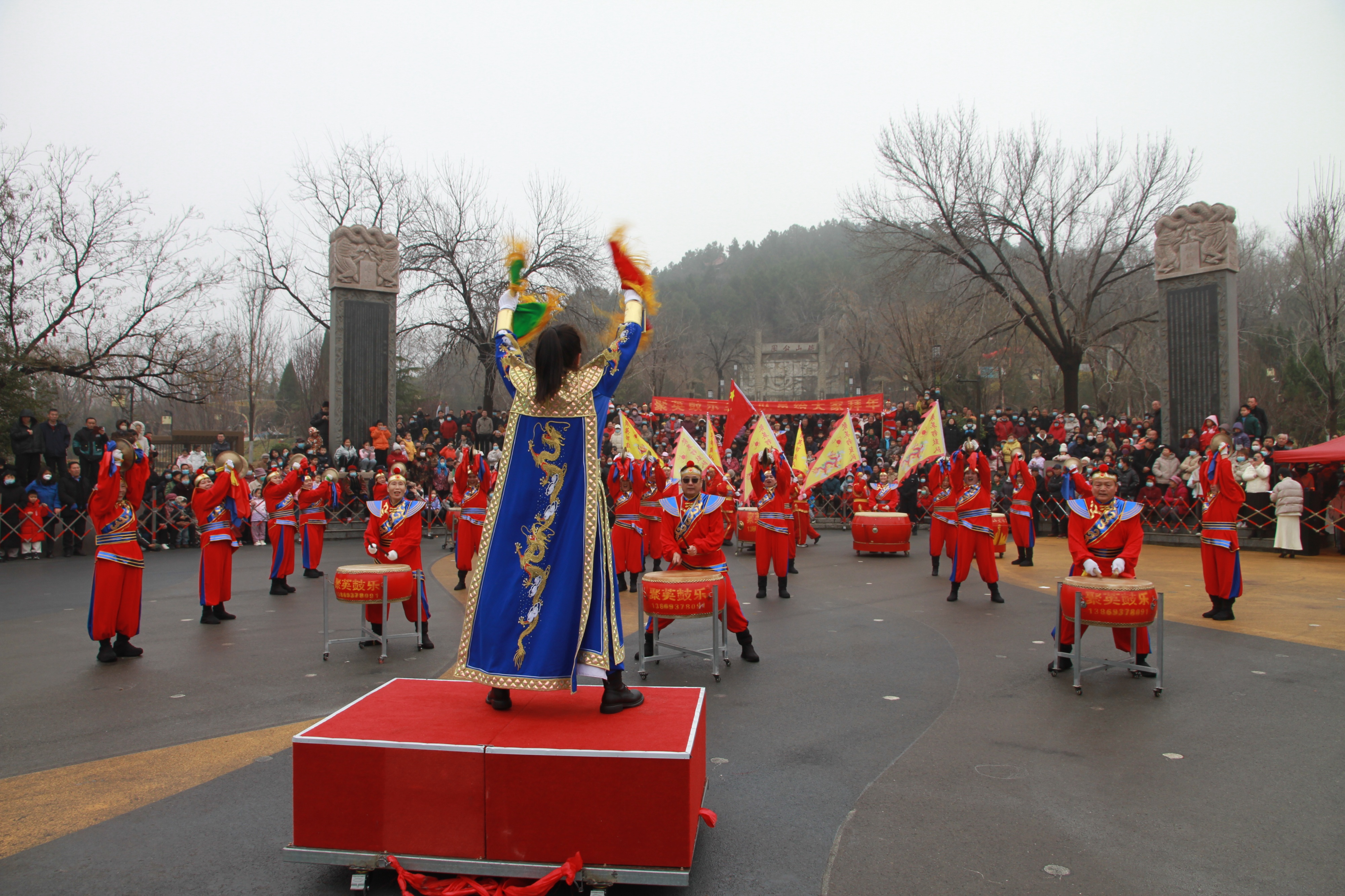 3月3日(农历正月十五),淄博高新区宝山管理中心傅山公园内张灯结彩、人声鼎沸,2026年“金鼓跃马闹元宵”元宵扮玩活动在此热闹举行。现场彩旗飘扬,锣鼓喧天,当地父老乡亲早早来到现场,将表演场地围得水泄不通,大家满怀期待,共庆这喜庆的元宵佳节。