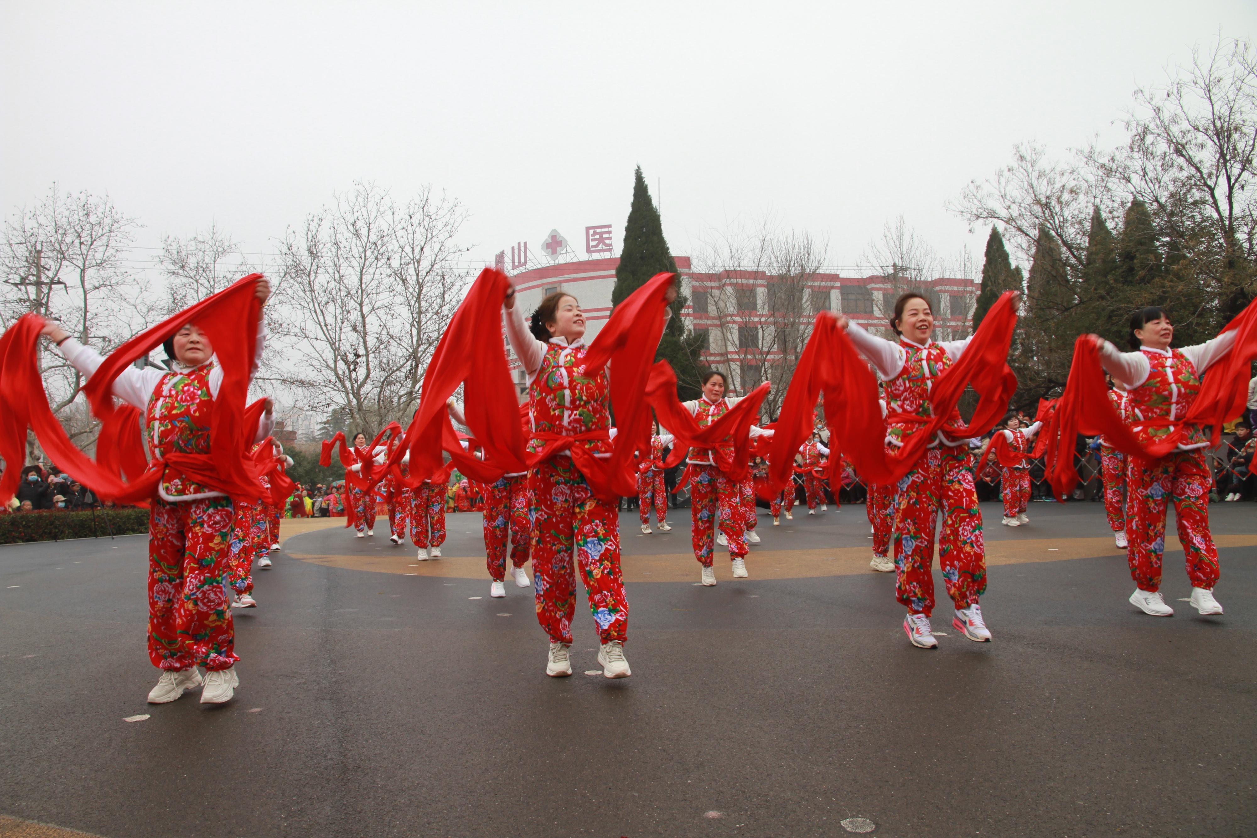 侯庄村辣妈舞蹈队的《拥军秧歌》同样精彩。队员们身着喜庆服饰,手持彩绸,踏着铿锵鼓点翩翩起舞。她们舞步整齐有力、神情昂扬饱满,将传统秧歌的韵味与拥军爱军的情怀完美融合。