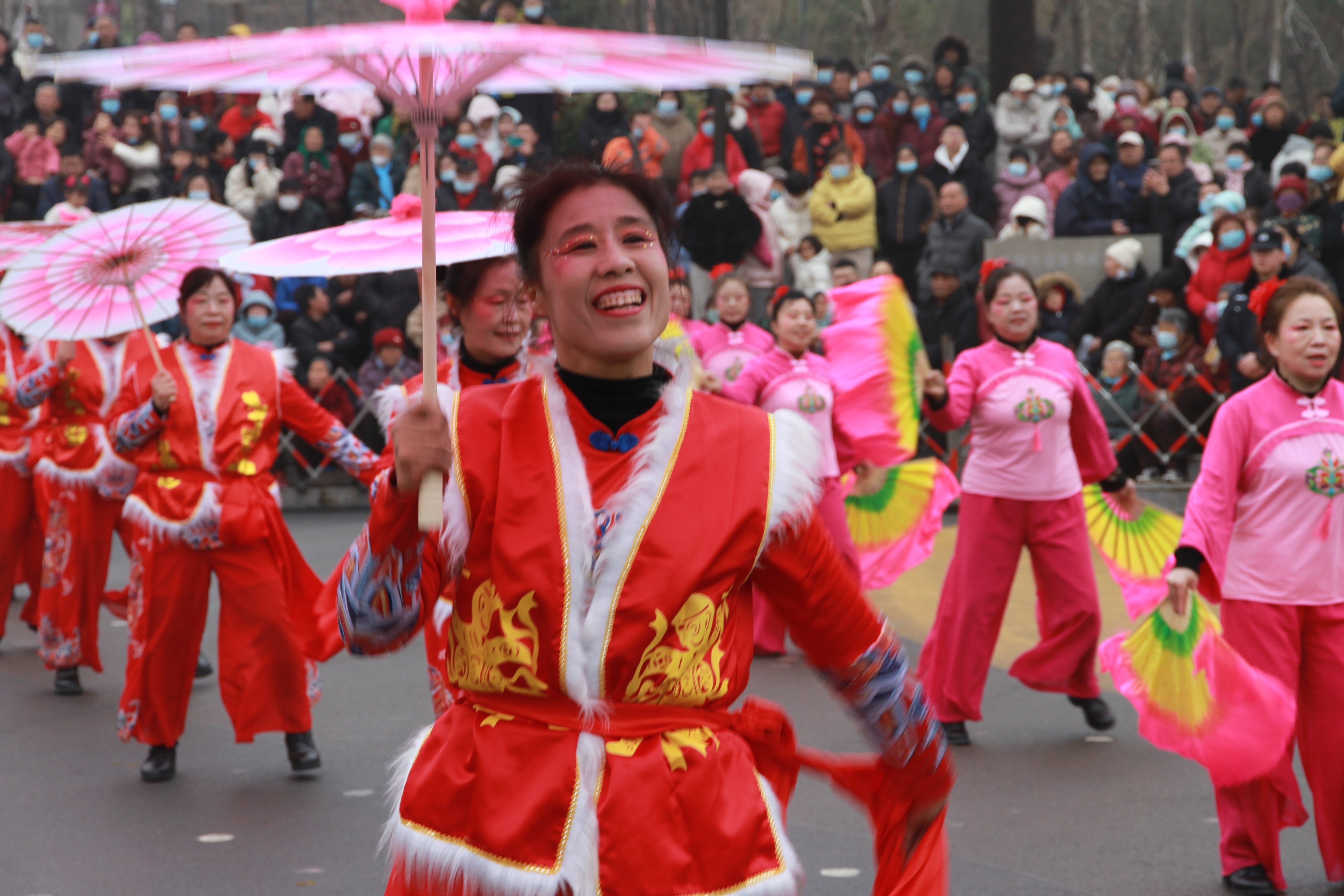 大寨村扮玩队的《红歌连唱》以扇子和小花伞为主的扮玩舞蹈,让现场充满了红色情怀。北河南村扮玩队的扇子舞明快节奏、灵动队形,展现村民昂扬风貌。舞者手持彩扇开合自如、舒展优美,步伐轻盈整齐,将民俗风情与乡村活力融为一体。金都花园社区扮玩队的《喜迎新春中国范》再次点燃现场热情。铿锵的鼓点,撞击心扉,激昂的旋律,鼓动天地。