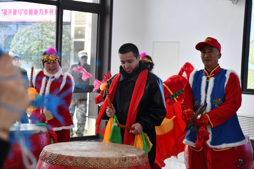 活动伊始,留学生们参观了春节非遗主题展览,精美的年画、剪纸、面塑作品,无声讲述着齐鲁大地的年俗故事。随后,小岭子金花艺术团带来胶东大秧歌和藏马大鼓表演,铿锵鼓声瞬间点燃全场热情。在演员们热情邀请下,留学生们纷纷加入互动行列,学扭秧歌、尝试敲鼓,在律动中感受中国民俗的感染力,现场欢声笑语不断。