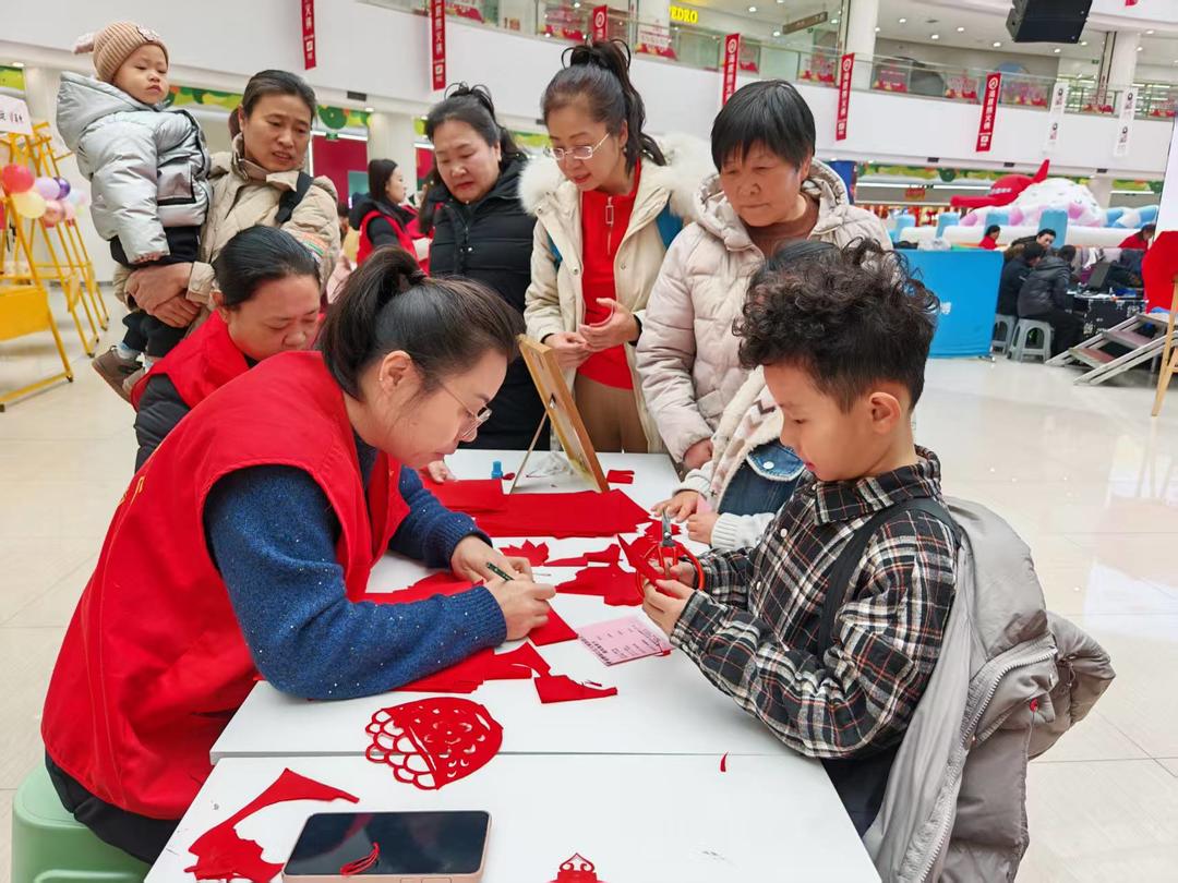 剪纸桌前,巧手翻折裁出吉祥图样。传统技艺在互动中焕发新生,童叟皆乐,其乐融融。