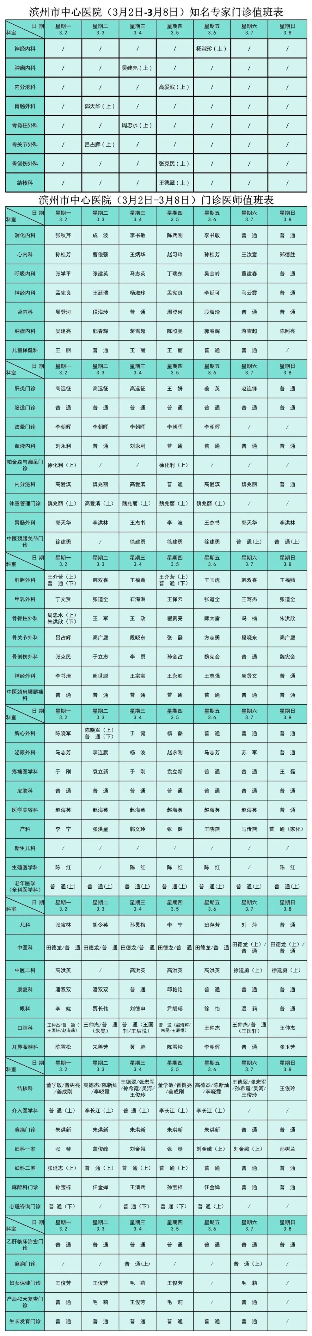 收藏丨滨州市中心医院2026年3月2日—8日门诊医师值班表