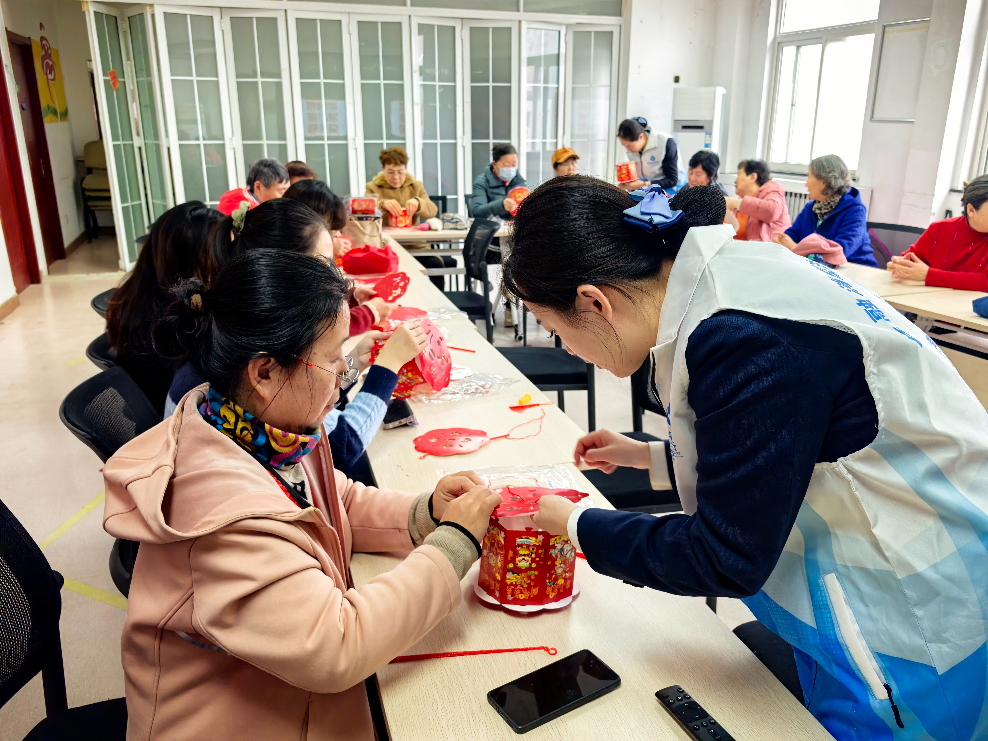谜面藏巧思,谜底见智慧。在湛山街道秀湛路社区,居民在社区工作人员的带领下,将灯笼主体材料、灯芯、挂绳、流苏等组装起来,变成精致的手工元宵花灯。