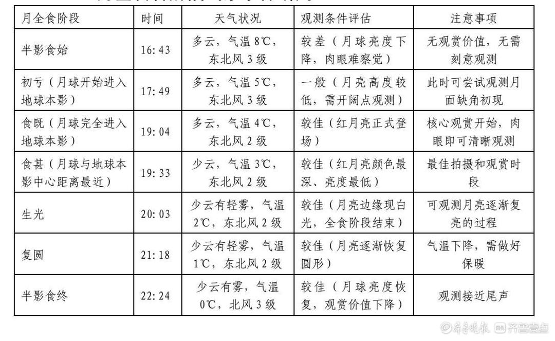 (二)观月建议:3月3日19时-22时,天气以少云为主,有轻雾,气温较低,观月时需注意防风保暖。若观测期间出现云团遮挡,可耐心等待,若遇突发天气变化,可关注实时天气预报,必要时选择线上天文直播观看月全食全过程。