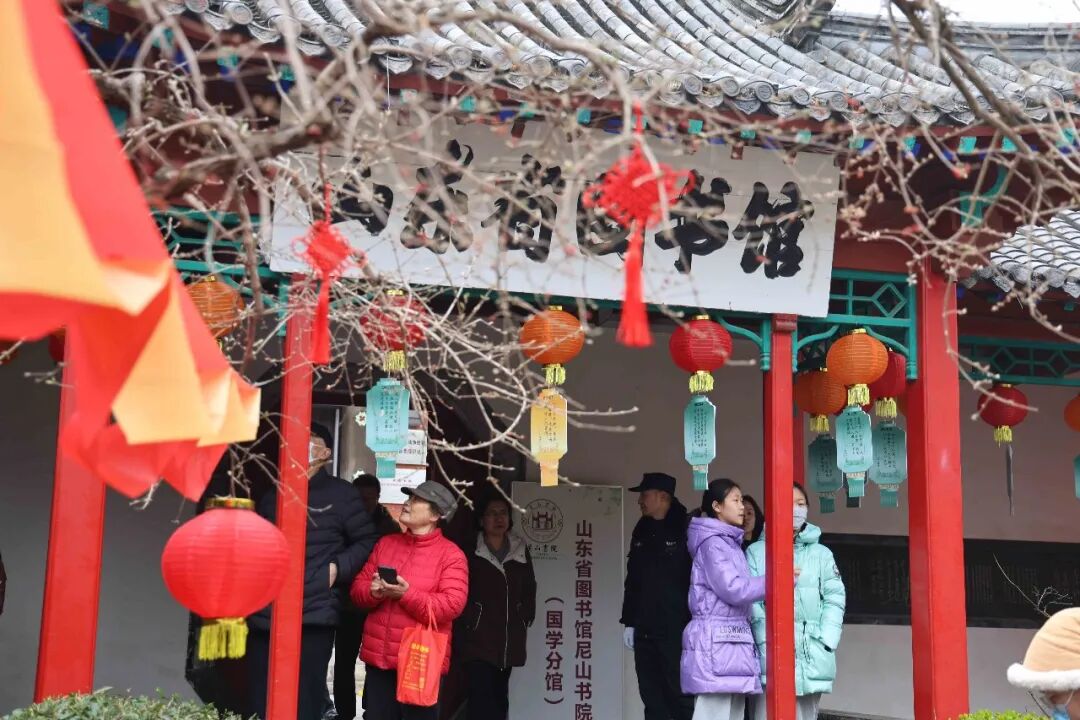遐园内,3000余条灯谜吸引着市民与游客驻足凝思。人们在竞猜中品味国学经典、重温泉城故事、领略民俗智慧。山东歌舞剧院担纲的“明湖好戏”首场公益演出在国学讲堂精彩上演,丝竹悠扬与湖光山色交相辉映,引来游人如织。