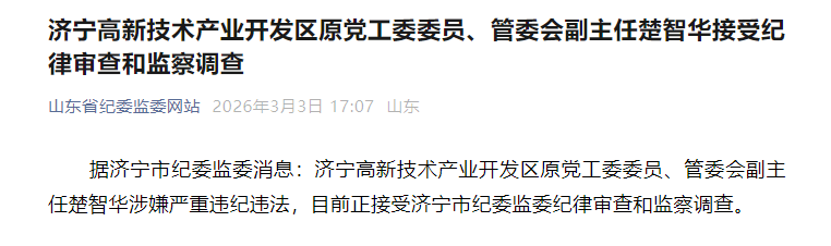 据济宁市纪委监委消息:济宁高新技术产业开发区原党工委委员、管委会副主任楚智华涉嫌严重违纪违法,目前正接受济宁市纪委监委纪律审查和监察调查。