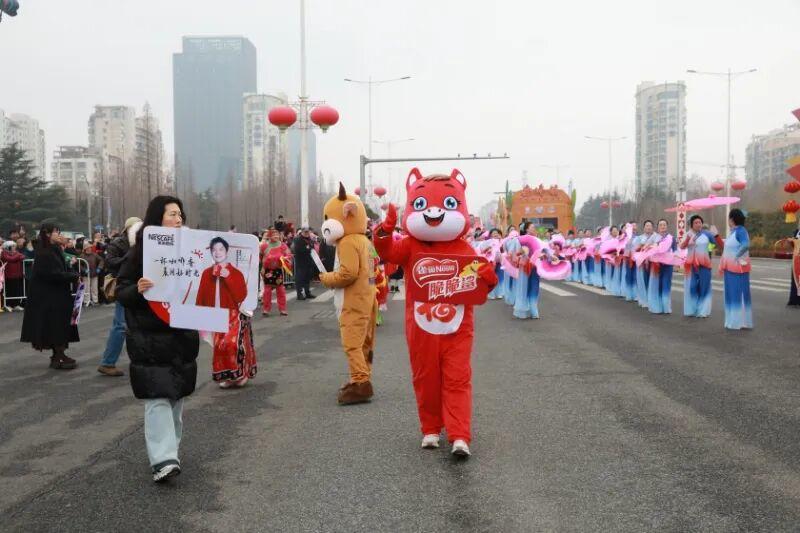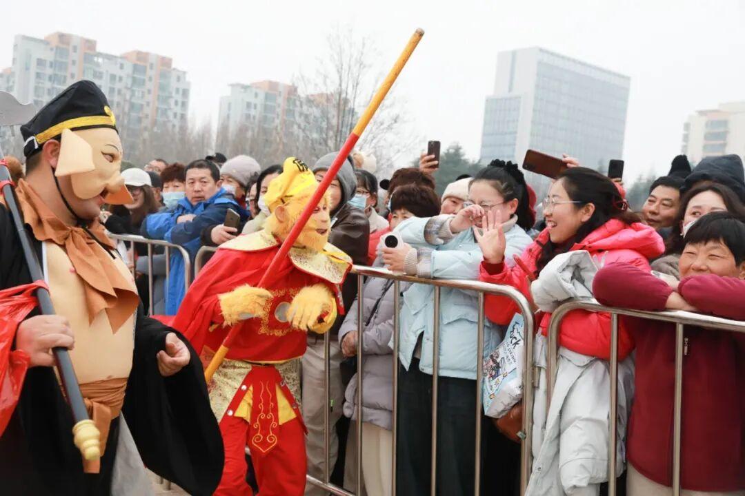 人民广场的舞龙队伍里,红色小马轮滑队员们化身“龙马使者”,与舞龙队员联动演绎“龙马精神”;科技狗闪亮登场,和演员一起扭秧歌;卡通马、水果宝宝、羊公主、牛宝宝等特色人偶穿梭于人群之中,与孩子们热情互动,引得小朋友们欢呼雀跃,争相合影。