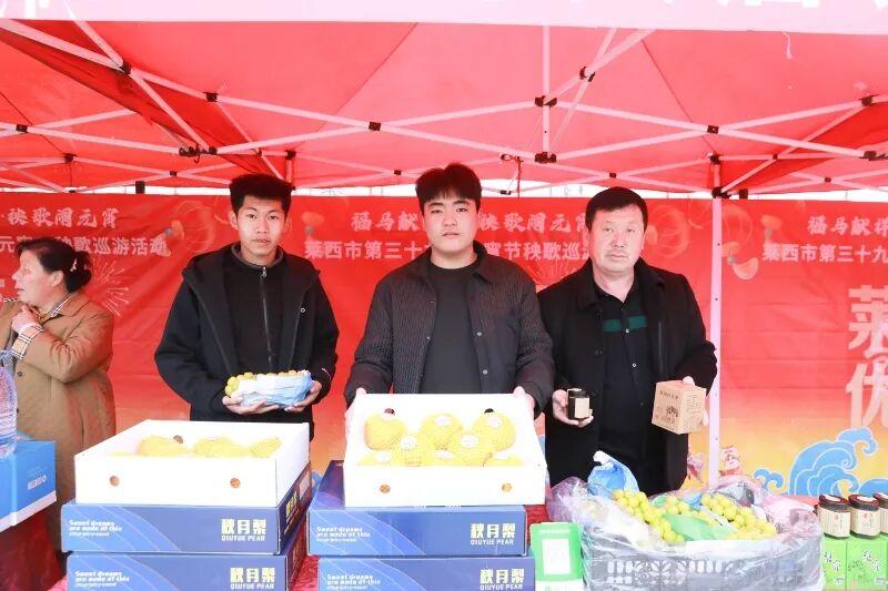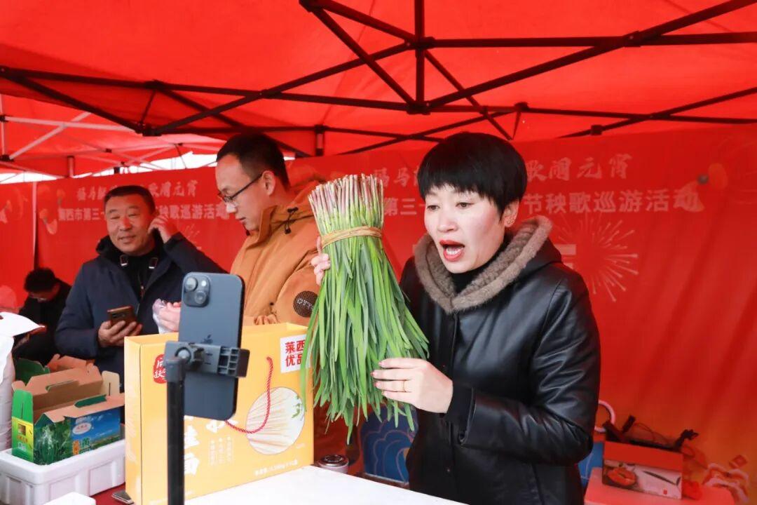 为了让广大市民游客在感受节庆氛围与民俗文化之余品尝莱西特色、带回莱西好物,活动现场特设“海洋大集・莱西优品・书记代言”展销专区。19个摊位整齐排布,莱发集团与11个镇街携近30类特色好物参展,17位村书记从田间地头走进直播间,化身“带货主播”,成为活动的一大亮点。
