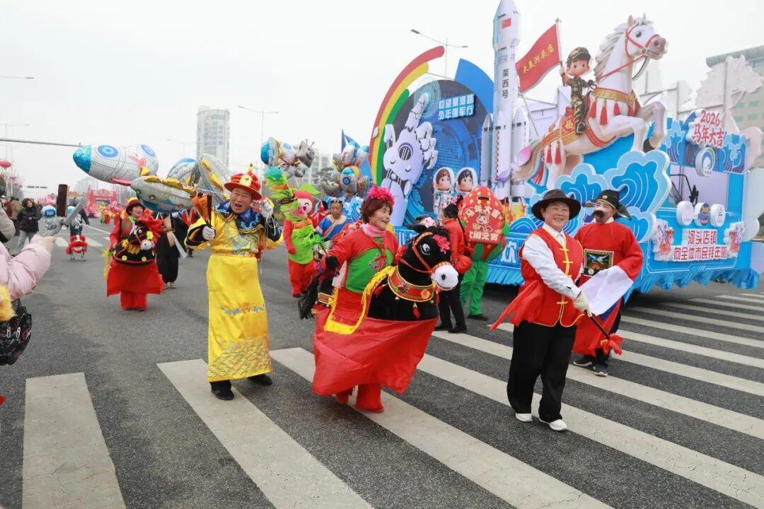 6名高跷队员扮成唐僧师徒与仙女,与锣鼓大世界、舞龙队伍协同表演,大龙盘旋游走、小龙憨态可掬,高跷队伍惟妙惟肖,传统民俗焕发出全新观赏性。定点展演区更是高潮迭起,快闪《相亲相爱》、歌伴舞《欢乐中国年》、武术《刀+棍+少林长拳》轮番上演,主持人同步推介各队伍风采,让现场观众沉浸式感受传统文化与现代艺术的碰撞融合。演员们身着艳丽服饰,踏着欢快舞步,将秧歌的喜庆奔放展现得淋漓尽致。沿途市民纷纷驻足观赏,掌声不断,大家用手机定格欢乐瞬间,全城沉浸在团圆喜庆的节日氛围中。