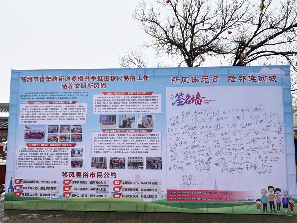 上午9点30分,活动尚未正式开始,入口处的签到区已排起了长队。“新风伴元宵 睦邻连两城”主题签到墙上,搭配着喜庆的元宵、灯笼图案,适龄青年拿起马克笔郑重签名,是对文明理念的践行与认同。旁边的移风易俗展板前,不少居民驻足观看,《临清市“深化移风易俗 倡树文明新风”倡议书》上,抵制高价彩礼、反对大操大办、拒绝铺张浪费等倡议清晰明了,街道移风易俗典型案例、工作成效的图文展示,更让大家直观感受到文明新风带来的变化。