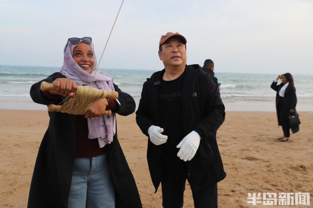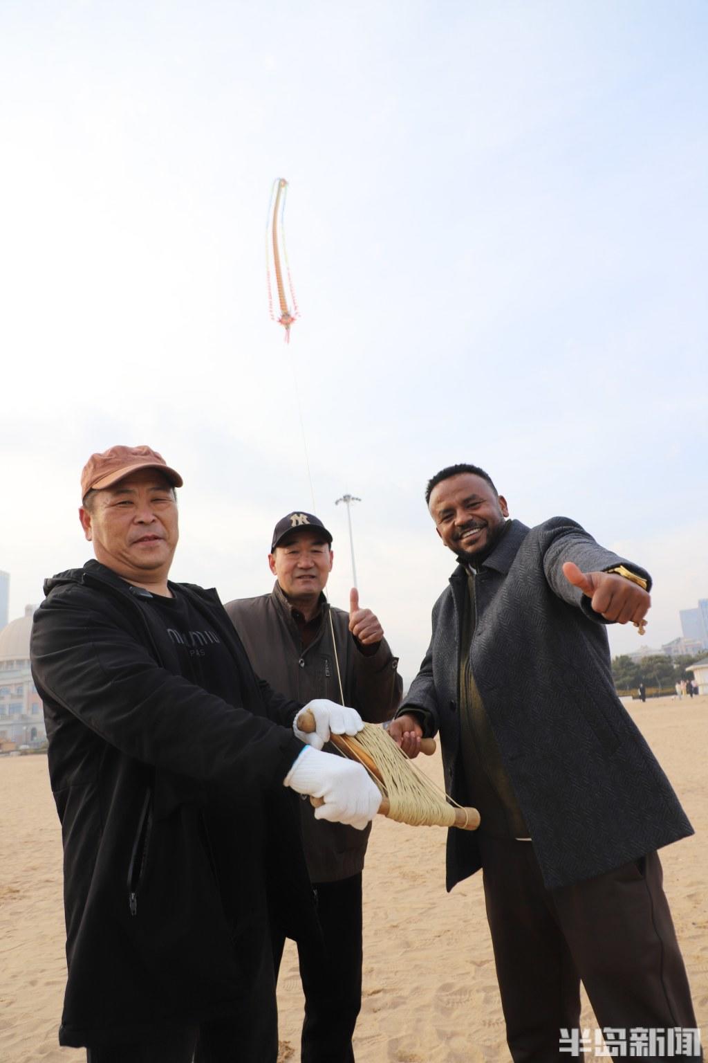 不远处,四五位外国友人被空中的“中国龙”吸引,举着手机不停拍摄。王存良见状,通过翻译邀请他们体验放风筝。来自埃塞俄比亚的麦凯尔先生接过线拐子,仰望着空中的风筝,由衷赞叹:“中国龙漂亮!”