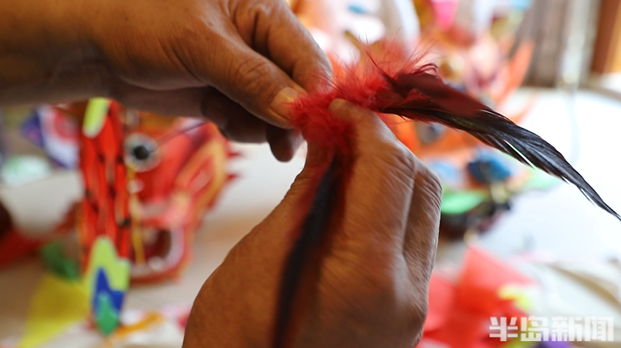 “这是专门为今年潍坊国际风筝会扎制的新风筝。”王存良一边用近似羽毛颜色的细线缠绕,将羽毛固定在纤维杆上,一边笑着介绍,“这次的风筝腰片色彩更靓丽,打算做满100片,总长能达到70米左右。”