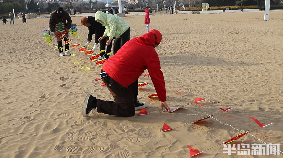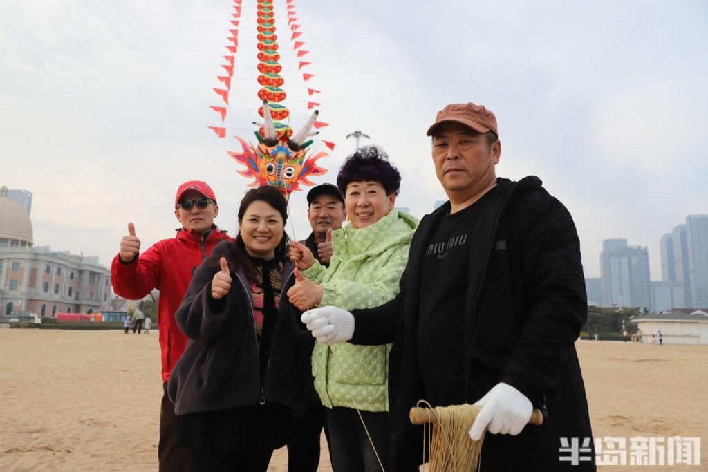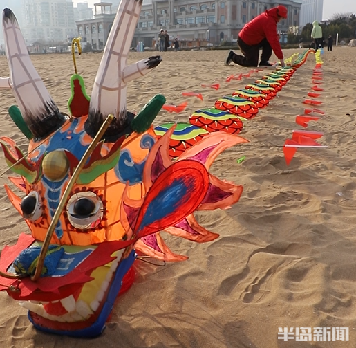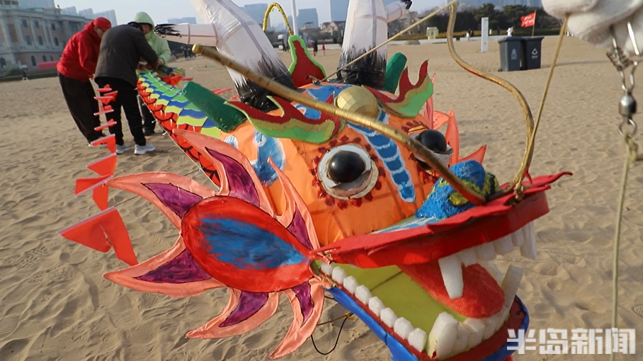 “放风筝最好的风向是南风,风力3至4级,这样风筝飞得稳,不容易乱摆。”王存良深谙其中门道,看了天气预报,得知2月28日下午刮南风,他便约了队友们驾车来到石老人海边。60多米长的龙头风筝,放飞绝非靠一人之力能完成,需要五六人通力协作,才能让“巨龙”顺利升空。
