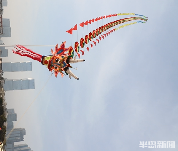 2月28日,在青岛石老人海边,一只60多米长的龙头风筝腾空而起,引得游客驻足欢呼、快门不停。
