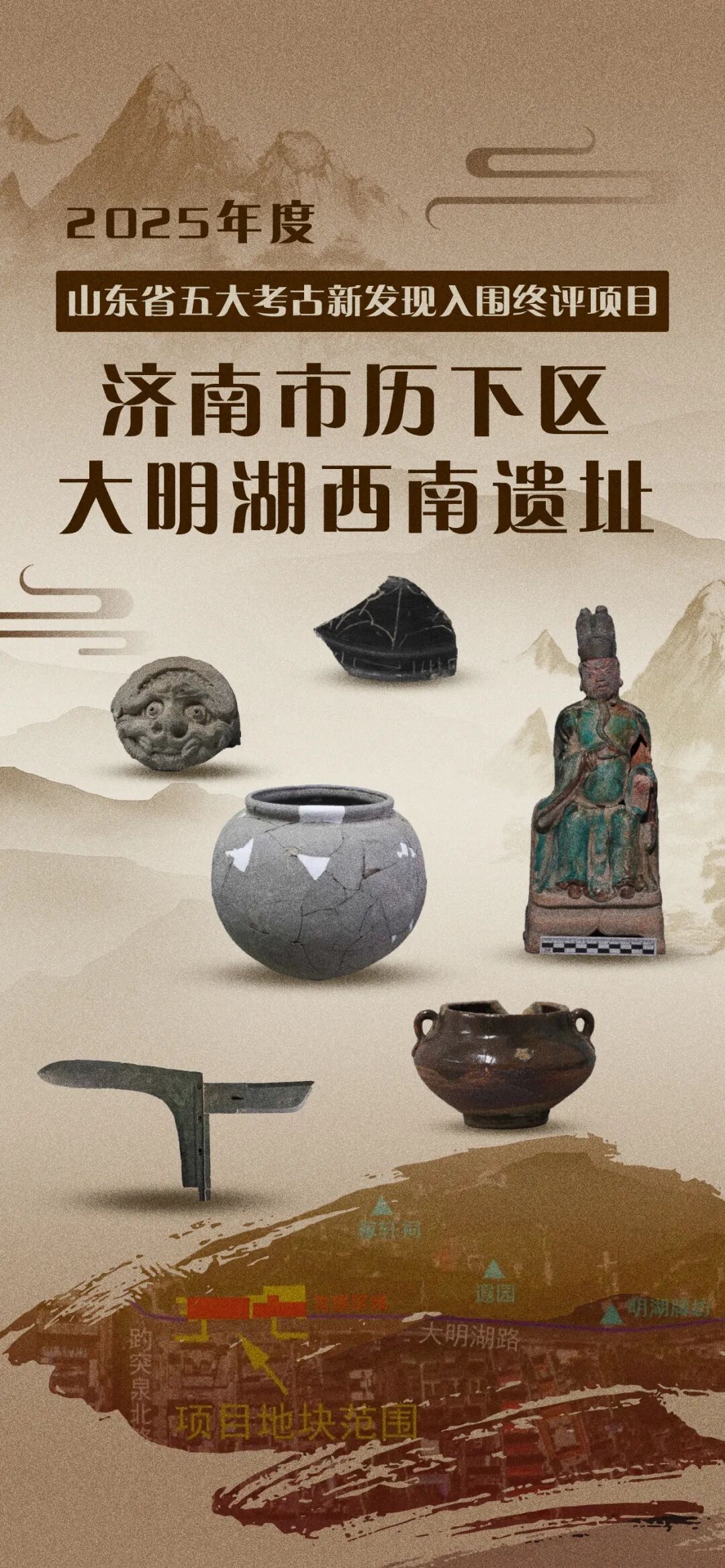 2025年度山东省五大考古新发现近日揭晓,淄博市淄川区老爷洞遗址、淄博市临淄区杨庄北遗址、济南市历下区大明湖西南遗址、菏泽市牡丹区南华遗址、东营市广北农场一分场一队盐业遗址从众多候选项目中脱颖而出。这五处遗址,从距今数万年的旧石器洞穴,到揭示史前文明的聚落密码;从见证济南城市变迁的“成长证明”,到记录黄河岸边岁月流转的城市年轮,再到渤海之畔的“超级制盐厂”,如同一把把钥匙,开启了通往不同历史时代的大门。